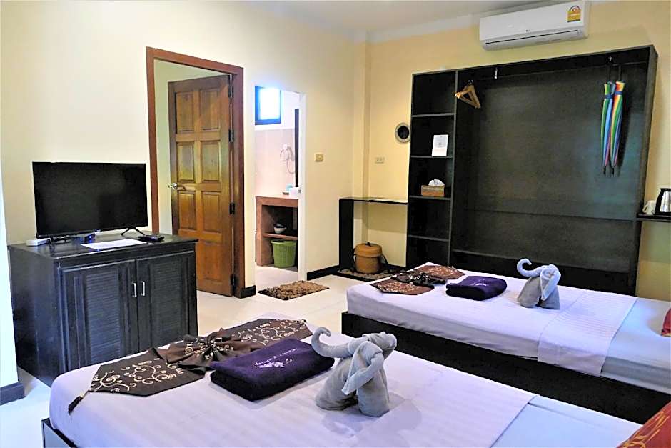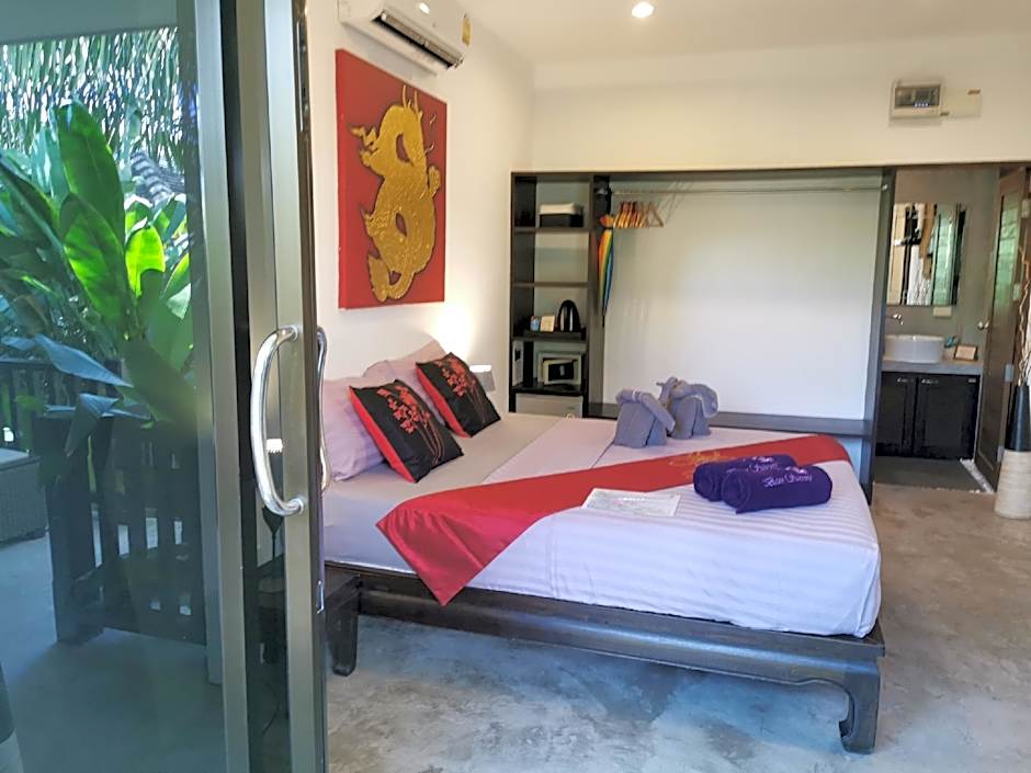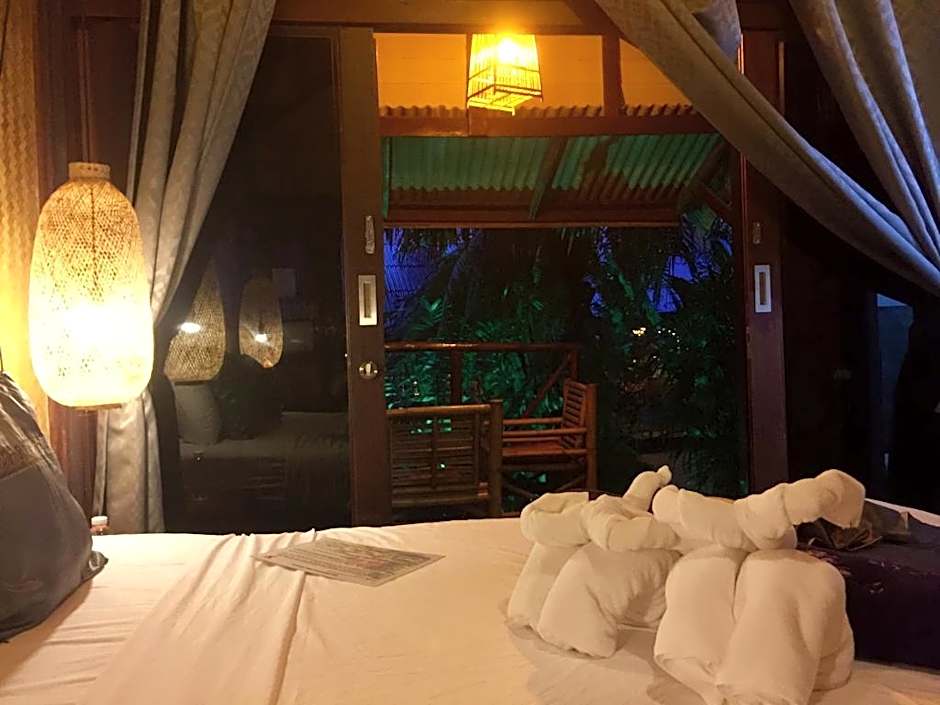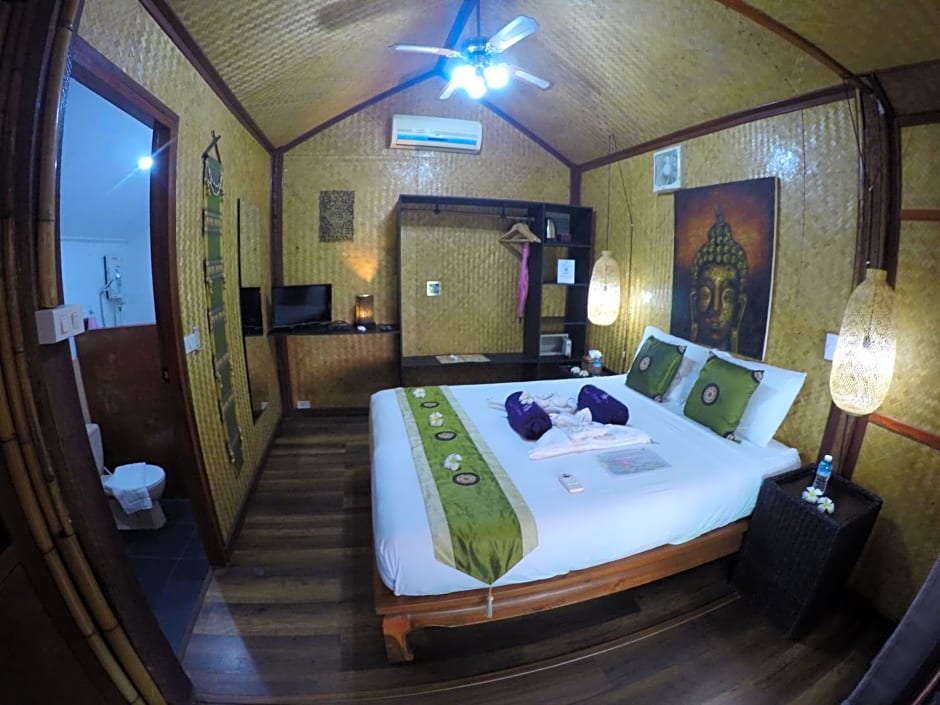 The Thai-style bamboo bungalow features one satellite TV, a safety deposit box and air conditioning per bedroom. The bungalow also has one mini-bar and a hammock on the private terrace. An internal door connects the 2 rooms together. An extra bed can be added on request at THB 500 to accommodate an extra person.