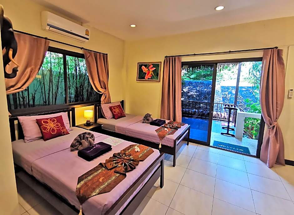 This air conditioned villa has a private terrace overlooking the garden and the swimming pool. It offers an outdoor living area. It is composed of two bedrooms and two private bathrooms. the 2 bedrooms are INDEPENDANT (connected by the terrace) An extra bed can be added on request at THB 500 to accommodate an extra person.